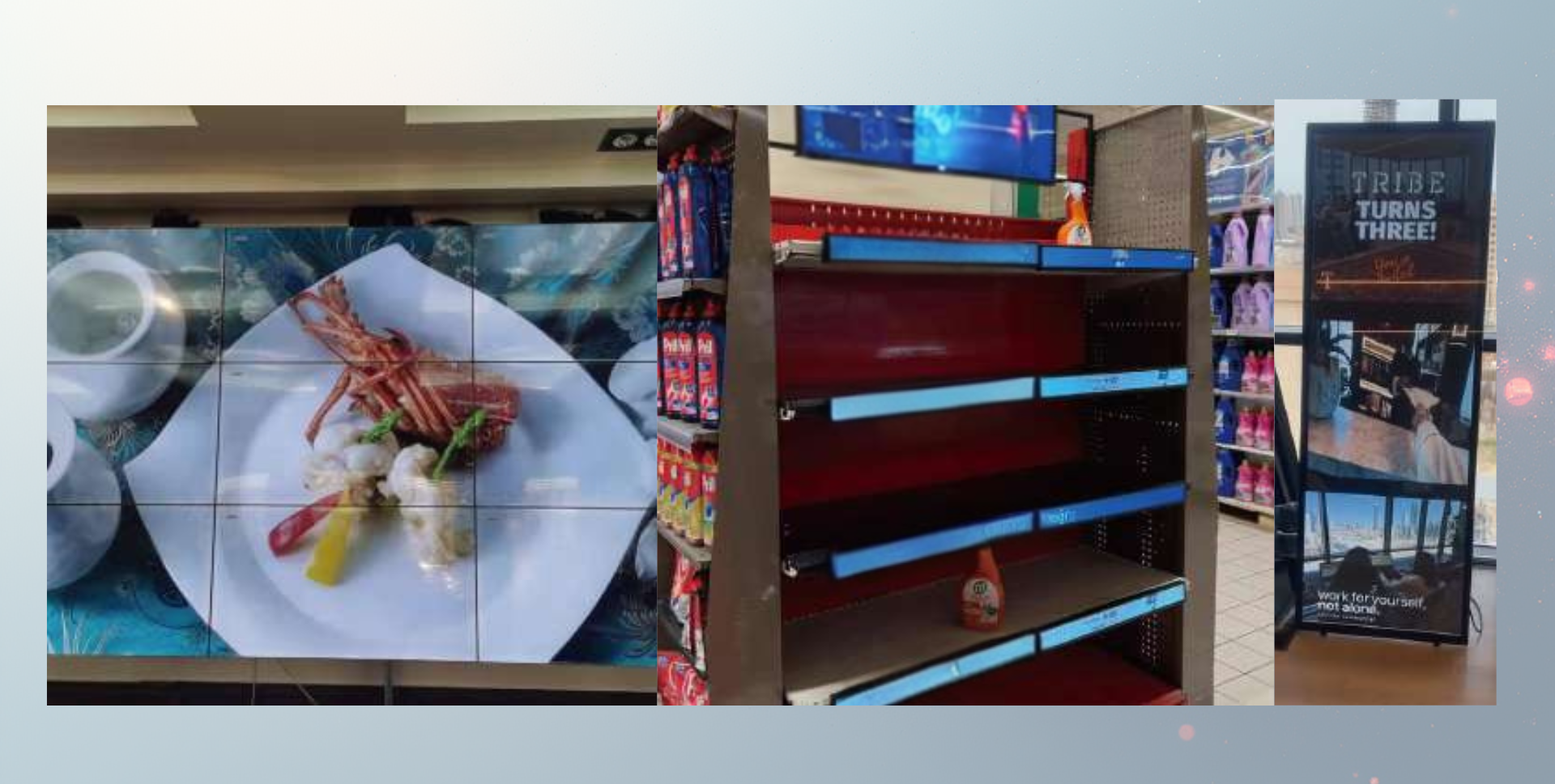 Posebni LCD zasloni omogočajo visoko stopnjo prilagoditve glede na velikost, obliko in funkcionalnost. Rešitve se razvijajo projektno, v skladu s potrebami prostora in vsebine.